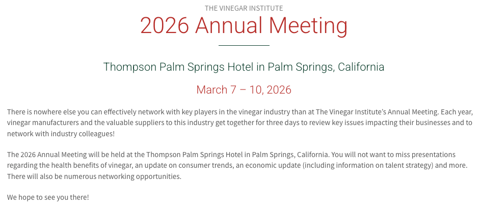 The 2026 Annual Meeting will be held at the Thompson Palm Springs Hotel in Palm Springs, California. You will not want to miss presentations regarding the health benefits of vinegar, an update on consumer trends, an economic update (including information on talent strategy) and more. There will also be numerous networking opportunities.